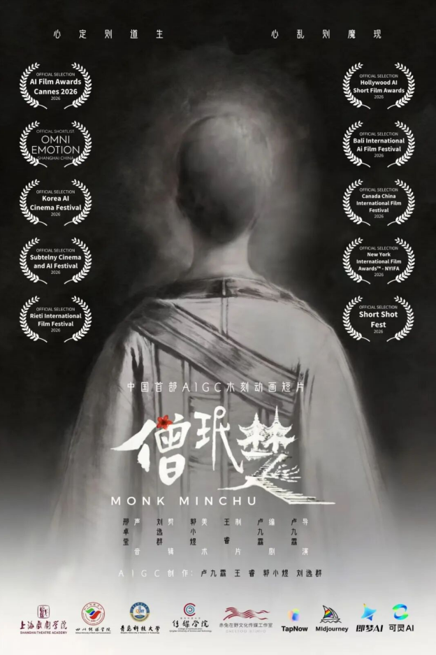值得一提的是,影片《僧珉楚》诞生在即梦Seedance2.0等新一代AI工具集中爆发的前夕。导演卢奎元同学坦言:“虽然制作时没能赶上最新技术,但也因此保留了作品独特的原生质感和美学风格。曾有许多朋友建议我用新技术重新修改调整,但我最终还是决定让作品保持原貌,这也算是AI上一阶段探索与尝试的珍贵记忆。”作品自问世以来,已接连入围戛纳人工智能电影奖、巴厘岛国际人工智能电影节、韩国人工智能电影节、好莱坞人工智能短片奖等十余项国际影展,成为中国青年AIGC创作者“以AI讲好东方故事”的代表性作品,也充分展现了学院在戏剧与影视专业的教学水平、创新能力与人才培养成效。