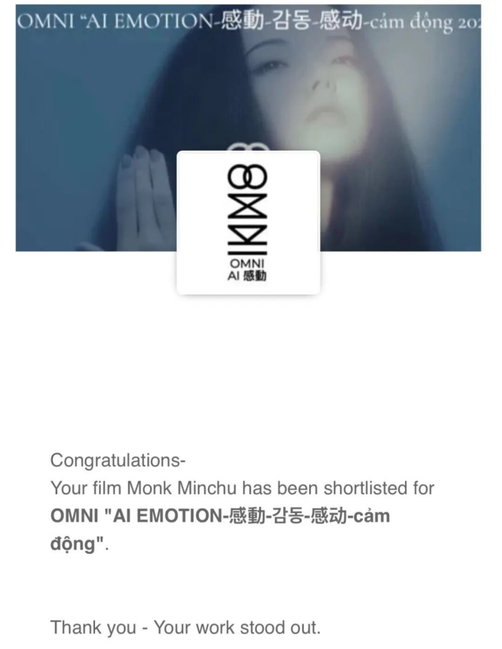 2026年3月,OMNI国际AI电影节携手上海AI短片电影节联合举办OMNI上海特别竞赛单元,打造亚太区顶级AI影像专项竞赛。本次征片范围覆盖中国、日本、韩国、东南亚、印度等多个国家和地区,总投稿量超500部 ,竞争极为激烈,经国际评审团多轮筛选,最终仅29部作品进入终审 ,《僧珉楚》成功突围入围。