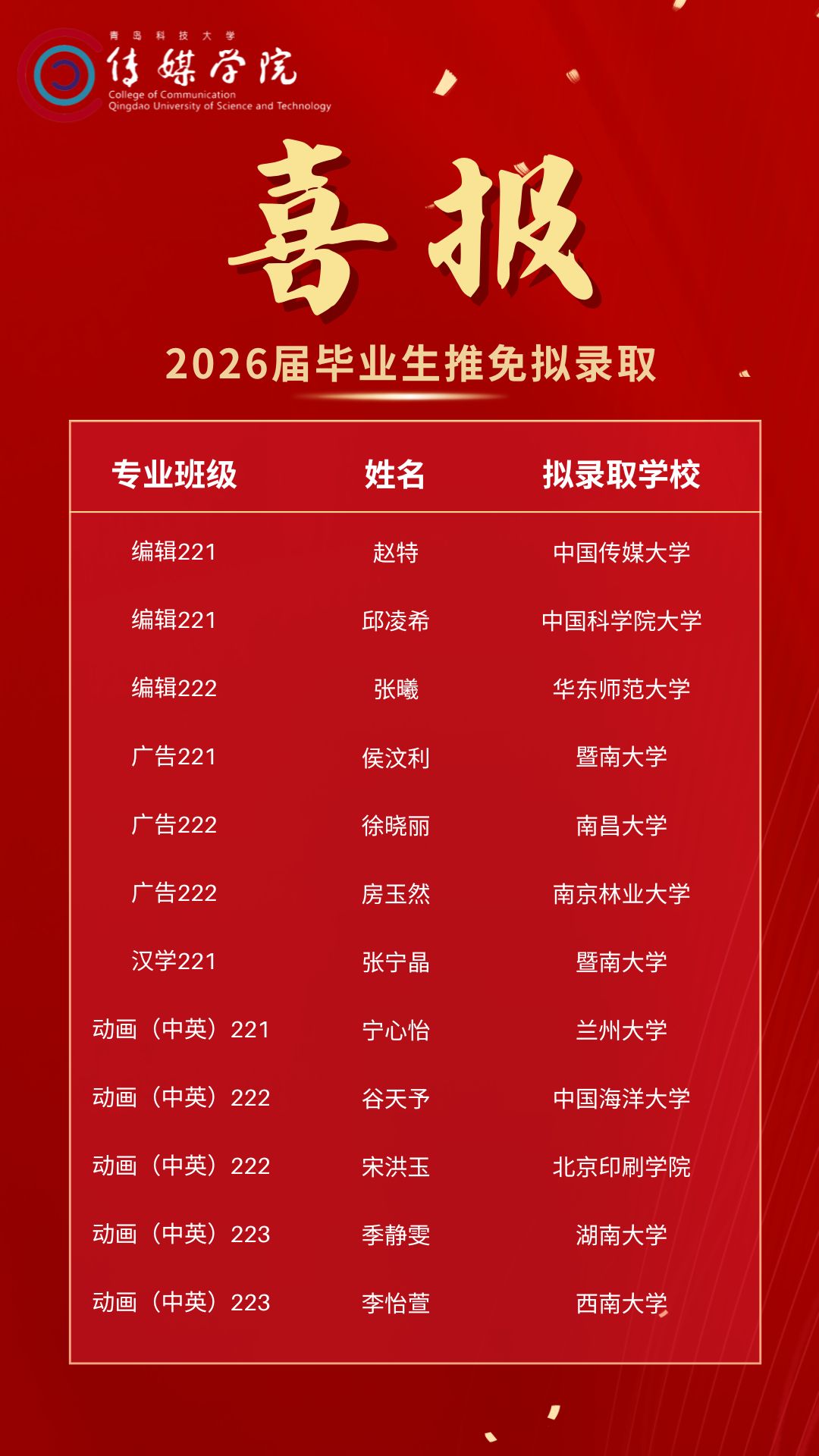 金秋送爽丰收至,佳音纷至喜气扬。近日,在全院师生的共同努力下,2026届推荐免试攻读研究生工作正式落幕,传媒学子再创佳绩,彰显优秀风采。编辑出版学、广告学、动画(中英)、汉语言文学专业获得推免资格的12名同学,均以优异的学业成绩和全面的综合素质成功推免至华东师范大学、中国海洋大学、湖南大学等国内知名高校。